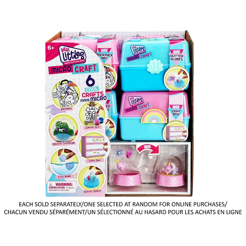 Nouveau dans la serie Real Littles: une selection de kits de bricolage super mignons en format mini! Ces petits kits de bricolage offrent un plaisir creatif aux enfants comme aux adultes. Dans ces adorables petites valises; vous trouverez des surprises miniatures a partir desquelles vous pourrez realiser de superbes bricolages! Quelles sont les activites creatives qui vous enthousiasment le plus? Il y a 6 boites differentes a collectionner. Collectionne le sac a dos de peinture DIY; la toile; la bombe a bulles; les boules a paillettes; la boite a lumiere et le terrarium licorne! De nombreux details soignes garantissent un grand plaisir de bricolage pour chaque projet. Et tous les outils fonctionnent vraiment! Tous les sets de bricolage sont livres avec un mousqueton pour que les enfants puissent les accrocher a leur classeur. Les Real Littles sont "Things you love made Micro" - C'est-a-dire tout ce que vous aimez en miniature!