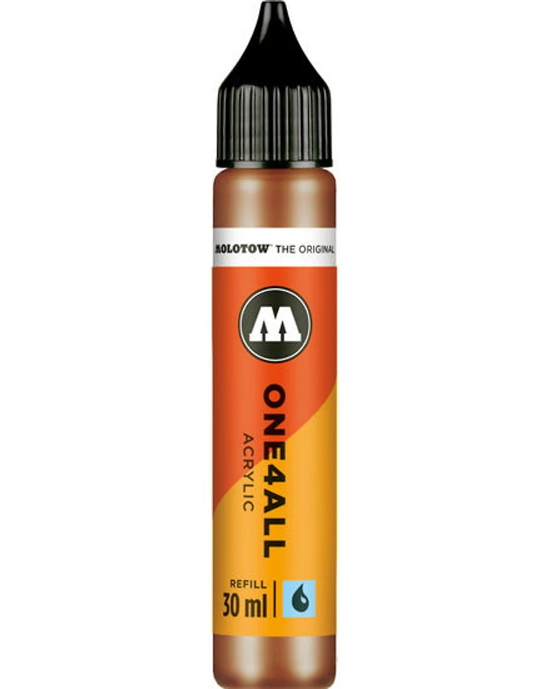 One4All, la peinture la plus universelle du marché. Qu’il s’agisse d’un marqueur, d’un pinceau, d’un tampon ou d’un aérographe, cette peinture hybride à base d’acrylique s’adapte à tous les outils et convient à presque toutes les surfaces : bois, métal, cuir, plastique, jouets, planches à roulettes, toile, murs, etc. Hautement pigmentée, elle est diluable à l’eau, résistante aux UV et aux intempéries, et ne contient pas de solvants. Convient aux applications intérieures et extérieures. Toutes les couleurs peuvent être mélangées entre elles. Cette peinture est conçue pour remplir les marqueurs acryliques One4All de Molotow, mais peut aussi être utilisée comme une acrylique fluide ordinaire et appliquée avec un pinceau, une éponge ou un couteau. La gamme Molotow One4All est écoresponsable comme tous les marqueurs sont réutilisables. De plus, les marqueurs et les peintures en aérosol utilisent la plus petite quantité de solvants possible, basée sur une peinture acrylique qui est composée à 85 % d'eau. L’emballage est respectueux de l'environnement et le fabricant a un programme de responsabilité sociale.