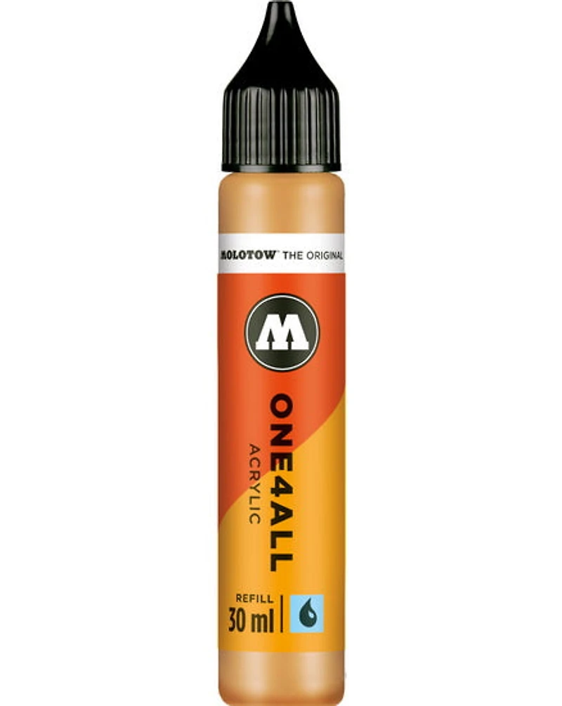 One4All, la peinture la plus universelle du marché. Qu’il s’agisse d’un marqueur, d’un pinceau, d’un tampon ou d’un aérographe, cette peinture hybride à base d’acrylique s’adapte à tous les outils et convient à presque toutes les surfaces : bois, métal, cuir, plastique, jouets, planches à roulettes, toile, murs, etc. Hautement pigmentée, elle est diluable à l’eau, résistante aux UV et aux intempéries, et ne contient pas de solvants. Convient aux applications intérieures et extérieures. Toutes les couleurs peuvent être mélangées entre elles. Cette peinture est conçue pour remplir les marqueurs acryliques One4All de Molotow, mais peut aussi être utilisée comme une acrylique fluide ordinaire et appliquée avec un pinceau, une éponge ou un couteau. La gamme Molotow One4All est écoresponsable comme tous les marqueurs sont réutilisables. De plus, les marqueurs et les peintures en aérosol utilisent la plus petite quantité de solvants possible, basée sur une peinture acrylique qui est composée à 85 % d'eau. L’emballage est respectueux de l'environnement et le fabricant a un programme de responsabilité sociale.