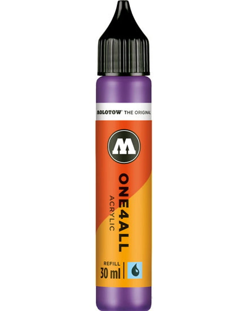 One4All, la peinture la plus universelle du marché. Qu’il s’agisse d’un marqueur, d’un pinceau, d’un tampon ou d’un aérographe, cette peinture hybride à base d’acrylique s’adapte à tous les outils et convient à presque toutes les surfaces : bois, métal, cuir, plastique, jouets, planches à roulettes, toile, murs, etc. Hautement pigmentée, elle est diluable à l’eau, résistante aux UV et aux intempéries, et ne contient pas de solvants. Convient aux applications intérieures et extérieures. Toutes les couleurs peuvent être mélangées entre elles. Cette peinture est conçue pour remplir les marqueurs acryliques One4All de Molotow, mais peut aussi être utilisée comme une acrylique fluide ordinaire et appliquée avec un pinceau, une éponge ou un couteau. La gamme Molotow One4All est écoresponsable comme tous les marqueurs sont réutilisables. De plus, les marqueurs et les peintures en aérosol utilisent la plus petite quantité de solvants possible, basée sur une peinture acrylique qui est composée à 85 % d'eau. L’emballage est respectueux de l'environnement et le fabricant a un programme de responsabilité sociale.