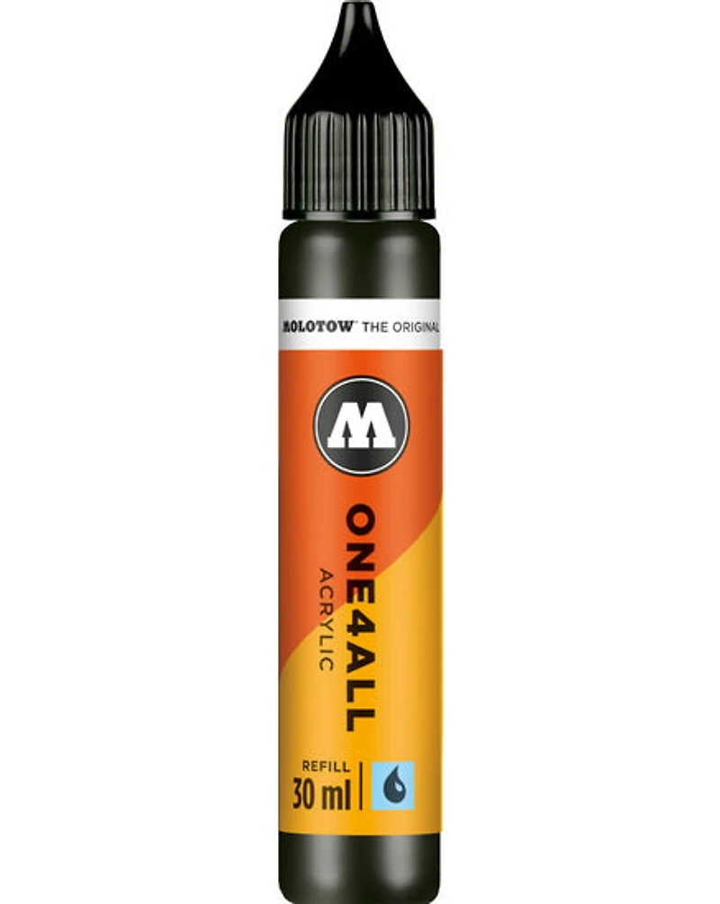 One4All, la peinture la plus universelle du marché. Qu’il s’agisse d’un marqueur, d’un pinceau, d’un tampon ou d’un aérographe, cette peinture hybride à base d’acrylique s’adapte à tous les outils et convient à presque toutes les surfaces : bois, métal, cuir, plastique, jouets, planches à roulettes, toile, murs, etc. Hautement pigmentée, elle est diluable à l’eau, résistante aux UV et aux intempéries, et ne contient pas de solvants. Convient aux applications intérieures et extérieures. Toutes les couleurs peuvent être mélangées entre elles. Cette peinture est conçue pour remplir les marqueurs acryliques One4All de Molotow, mais peut aussi être utilisée comme une acrylique fluide ordinaire et appliquée avec un pinceau, une éponge ou un couteau. La gamme Molotow One4All est écoresponsable comme tous les marqueurs sont réutilisables. De plus, les marqueurs et les peintures en aérosol utilisent la plus petite quantité de solvants possible, basée sur une peinture acrylique qui est composée à 85 % d'eau. L’emballage est respectueux de l'environnement et le fabricant a un programme de responsabilité sociale.