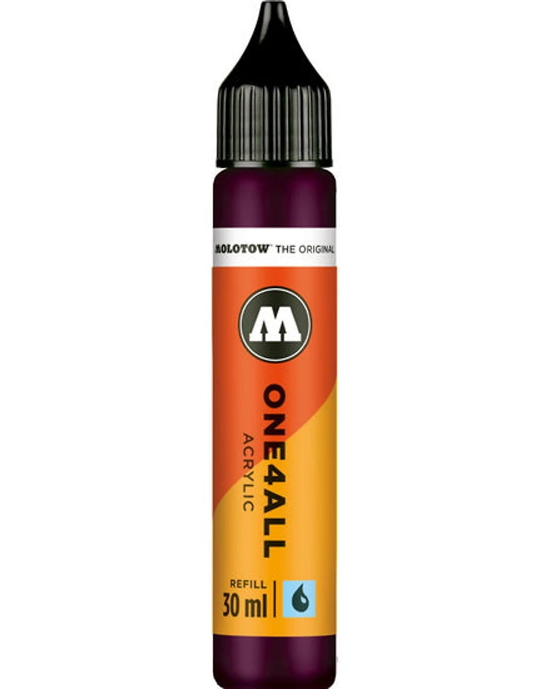 One4All, la peinture la plus universelle du marché. Qu’il s’agisse d’un marqueur, d’un pinceau, d’un tampon ou d’un aérographe, cette peinture hybride à base d’acrylique s’adapte à tous les outils et convient à presque toutes les surfaces : bois, métal, cuir, plastique, jouets, planches à roulettes, toile, murs, etc. Hautement pigmentée, elle est diluable à l’eau, résistante aux UV et aux intempéries, et ne contient pas de solvants. Convient aux applications intérieures et extérieures. Toutes les couleurs peuvent être mélangées entre elles. Cette peinture est conçue pour remplir les marqueurs acryliques One4All de Molotow, mais peut aussi être utilisée comme une acrylique fluide ordinaire et appliquée avec un pinceau, une éponge ou un couteau. La gamme Molotow One4All est écoresponsable comme tous les marqueurs sont réutilisables. De plus, les marqueurs et les peintures en aérosol utilisent la plus petite quantité de solvants possible, basée sur une peinture acrylique qui est composée à 85 % d'eau. L’emballage est respectueux de l'environnement et le fabricant a un programme de responsabilité sociale.