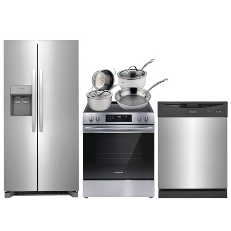 Réfrigérateur à congélateur juxtaposé 33 po 22,3 pi³ de Frigidaire; Cuisinière électrique; Lave-vaisselle; Batterie de cuisine - Acier inoxydable