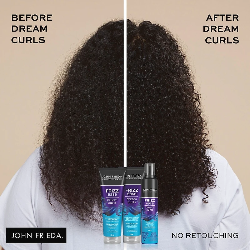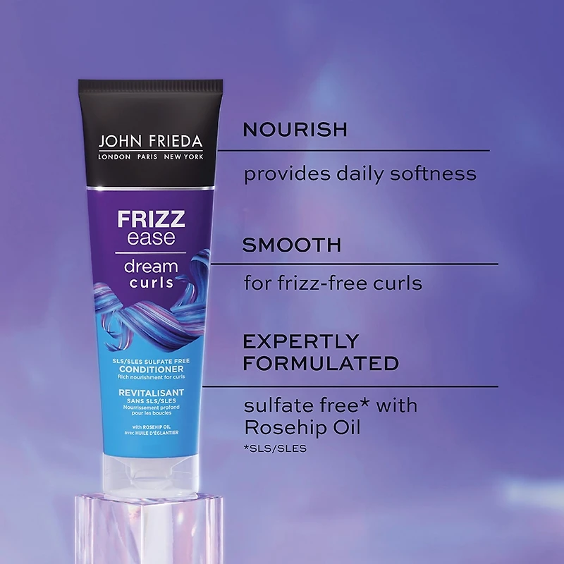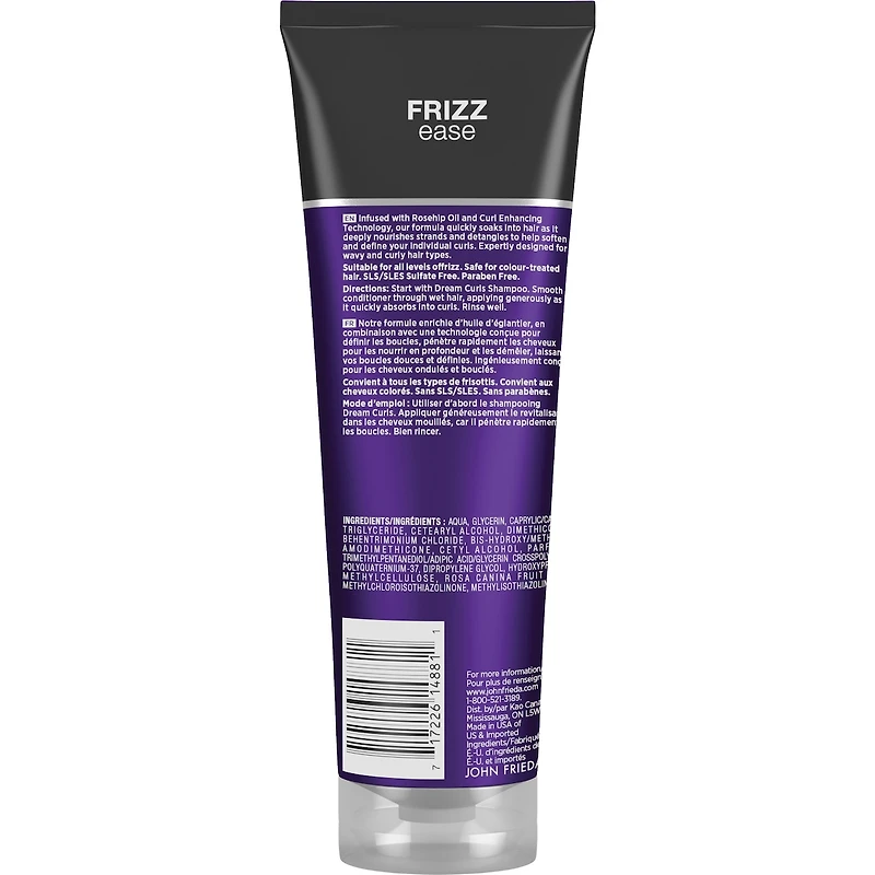 - Obtenez des boucles définies avec du ressort grâce au revitalisant sans SLS/SLES Frizz Ease Dream Curls de John Frieda. Avec sa formule enrichie d’huile d’églantier régénérante, ce revitalisant hydrate et démêle les cheveux en douceur. Il répare les fibres capillaires, définit les boucles et laisse les cheveux doux au toucher et d’apparence saine. Revitalisez vos cheveux comme il faut et obtenez de belles boucles pleines de ressort. Idéal pour les cheveux frisottés, bouclés et ondulés, et convient aux cheveux colorés. • Technologie conçue pour définir les boucles • Convient aux cheveux colorés • Non testé sur des animaux • Sans SLS/SLES • Sans parabènes • Sans phtalates