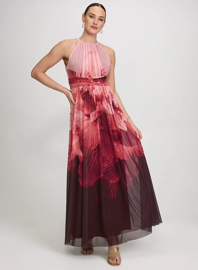 Notre robe à col licou présente un captivant motif ombré pour un effet multidimensionnel. Associez-la à des boucles d'oreilles pendantes et à une pochette élégante pour compléter votre look.Silhouette ajustée et évaséeMotif floral à effet dégradé Encolure licouSans manchesCorsage à plus verticauxInsertion plissée à la tailleDoubléeMatière tranpsaarenteLongueur à partir de l'épaule : 58 po