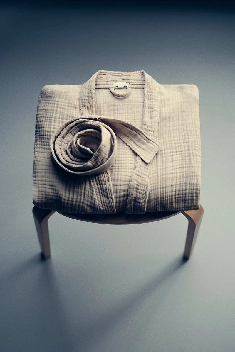 Robe de chambre en douce mousseline de coton. Modèle à col châle avec ceinture amovible à nouer à la taille et poches plaquées devant.