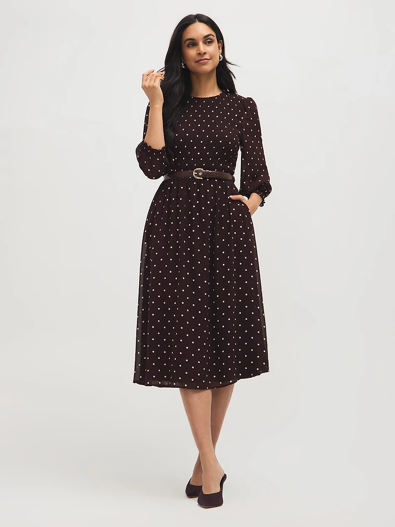 Cette robe mi-longue en mousseline à pois allie un imprimé ludique à une élégance intemporelle. Le corsage smocké ajusté et la jupe fluide dessinent une silhouette féminine et flatteuse, tandis que les manches longues transparentes apportent une touche de légèreté et d'élégance. Dotée de poches latérales, c'est une pièce classique et moderne, idéale pour passer du jour à la soirée avec style et assurance.