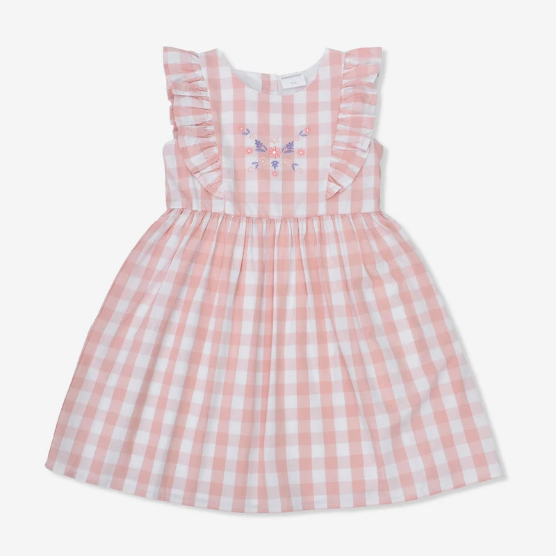 Cette robe adorable est parfaite pour temps chaud. Robe sans manches avec volants. Encolure ronde avec ouverture boutonnée au dos pour un habillage facile. Oeuvre de broderie sur le corsage. Jupe entièrement doublée avec fronces à la taille. La tenue la plus mignonne pour votre petite fille.