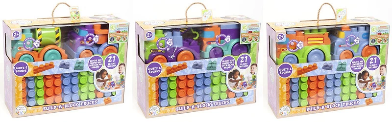 Avec 21 blocs et 2 camions différents avec lumières et sons, votre tout-petit aura tellement de possibilités de jeu et de développement de la motricité ! Utilisez les gros blocs pour construire facilement des routes, assembler des bâtiments ou créer des obstacles imposants. Les blocs peuvent également être empilés sur les camions.