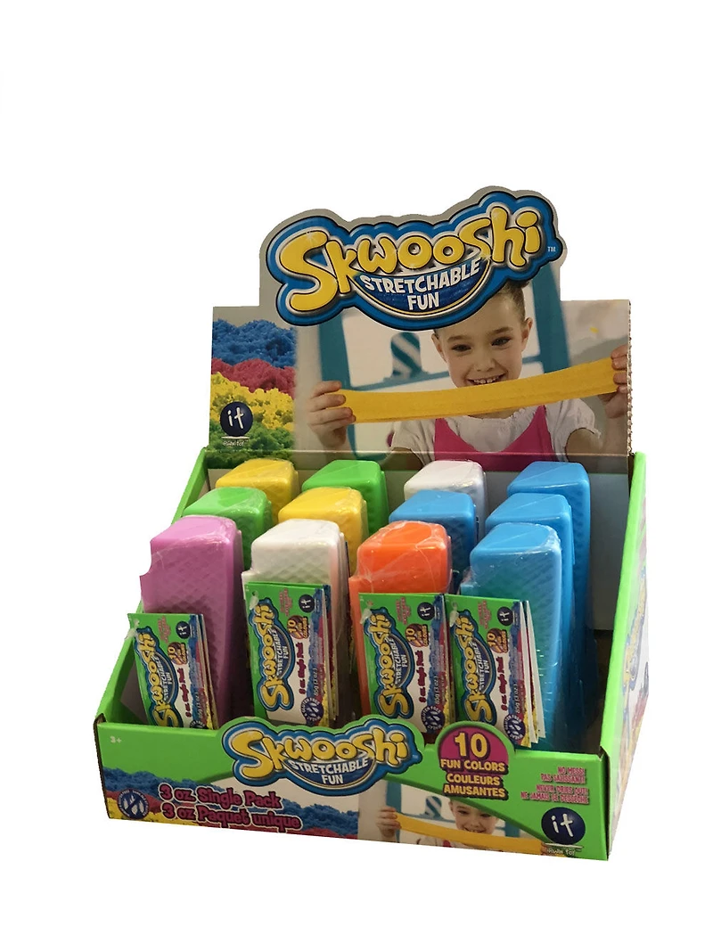 Contenants de 3 oz de Skwooshi en 6 couleurs assorties, bleu, rouge, vert, jaune, violet, orange. Collectez les tous! Skwooshi est une pâte incroyable, moulable et extensible qui ne sèche jamais! Sans désordre, 100% non toxique, sans gluten, sans caséine. Créez des formes et des personnages étonnants, construisez avec et mélangez les couleurs.