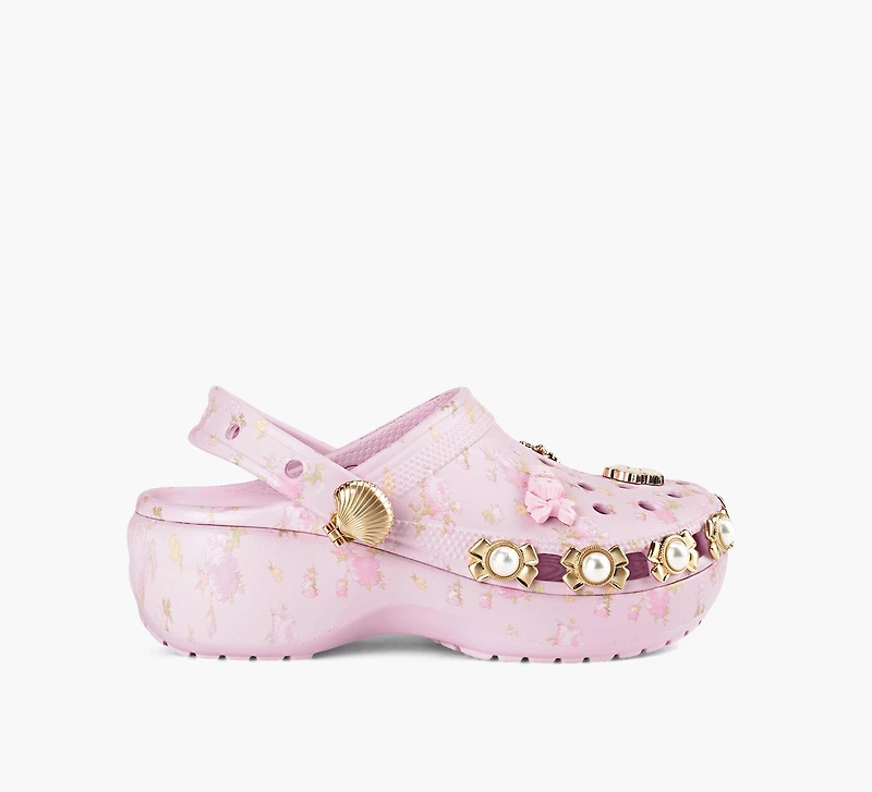 S’il y a bien une chose que Crocs maîtrise à la perfection, c’est l’art des collaborations iconiques. Dernière en date : LoveShackFancy. Mariant le confort emblématique de la marque de chaussures à l’esthétique romantique et fantaisiste de la compagnie décontractée, cette version du Sabot Plateforme Classic se distingue par des rivets et des breloques exclusives, le tout sublimé par un imprimé floral délicatement fleuri.