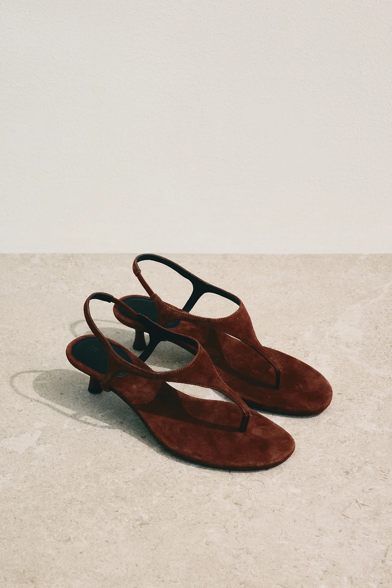 Sandales en cuir velours avec talon bobine. Modèle à bout rond avec entre-doigts, bride en T et fine bride de cheville munie d'un élastique sur un côté.