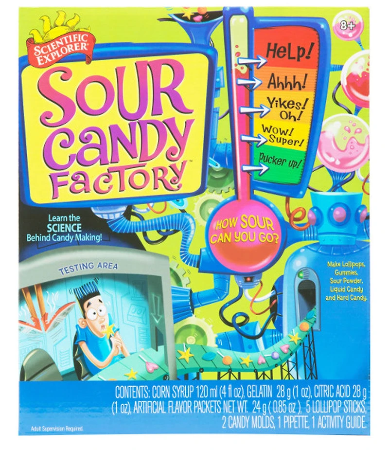 Explorateur scientifique Sour Candy Factory enseignera aux jeunes confiseurs la science derrière la fabrication de bonbons! Expérimentez avec les textures et l'intensité aigre comme vous créez vos propres sucettes, bonbons durs, gommes, poudre aigre et plus. Vous n'avez pas besoin d'un laboratoire rempli d'équipement de fantaisie pour être un scientifique de la nourriture réussie, toutes les fournitures dont vous avez besoin peuvent être trouvés dans ce kit, dans votre cuisine ou sur les étagères de votre épicerie locale. La famille et les amis se plisseront vers le haut des bonbons que votre enfant crée avec 6 différentes activités savoureuses. Comment aigre pouvez-vous gérer? Comprend le sirop de maïs (4 oz), la gélatine (1 oz), l'acide citrique (1oz), les paquets de saveur artificielle de framboise, de raisin et de pastèque (0,85 oz), 5 bâtonnets de sucettes, 2 moules à bonbons, une pipette et un guide d'activité. Recommandé pour les enfants de 8 ans et plus.