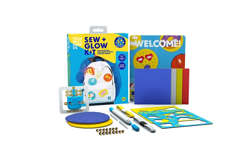 Sew + Glow Kit CONCEVOIR DES BADGES QUI S'ÉCLAIRENT AVEC LE FIL ELECTRO Concevez et illuminez vos badges Devenez un maître de l'électronique en quelques minutes Créez de nouveaux designs et combinaisons sans fin