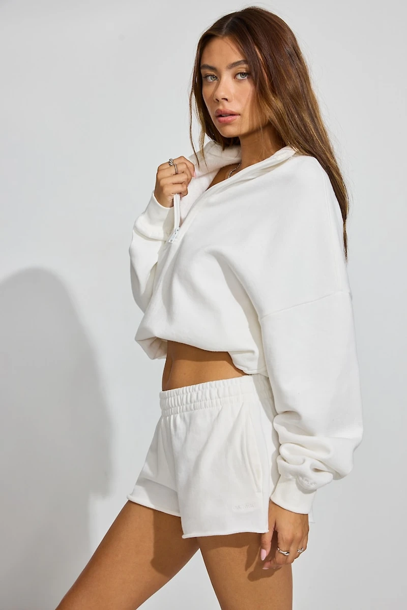 La fille d’à côté qui étonne dans un petit short et un sweatshirt à col rond.