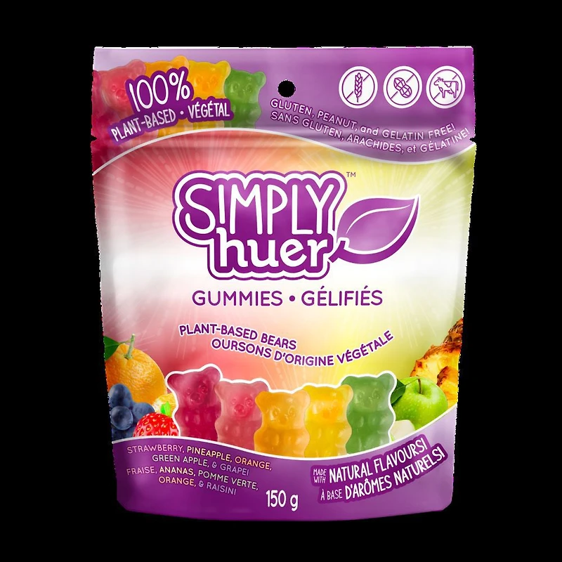 Les oursons Simply Huer à base de plantes sont une gaterie gommeuse douce et rassasiante. Offrez-vous Simply Huer en sachant que chaque bouchée contient des aromes et des couleurs de fruits naturels et qu'elle est exempte de gluten, d'arachides et de gélatine.