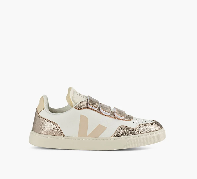 La V‑90 de VEJA est une basket pensée pour accompagner les enfants au quotidien. Fabriquée au Brésil, elle est dotée d’une tige en cuir Organic Traced avec des empiècements en suède pour plus de résistance. Sa semelle intérieure en EVA biosourcé assure un confort adapté aux pieds en croissance, tandis que la semelle extérieure en caoutchouc amazonien offre une adhérence fiable pour jouer et bouger toute la journée.