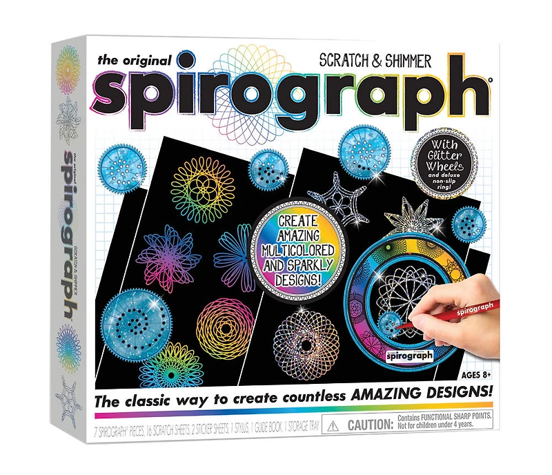 Créez de saisissantes oeuvres Spirograph avec cet ensemble de motifs à gratter! Servez-vous du stylet avec l'anneau et les roues scintillantes pour gratter des motifs sur les planches à gratter étincelantes ou arc-en-ciel spéciales. Vous pouvez aussi vous servir de vos propres marqueurs et stylos pour dessiner des motifs Spirograph sur du papier ordinaire! Dès 8 ans. Inclut 1 stylet à dessin, 1 anneau antidérapant de luxe, 6 roues scintillantes, 8 planches à gratter étincelantes, 1 feuille d'autocollants scintillants, 8 planches à gratter arc-en-ciel, 1 feuille d'autocollants arc-en-ciel, 1 plateau de rangement et 1 guide.