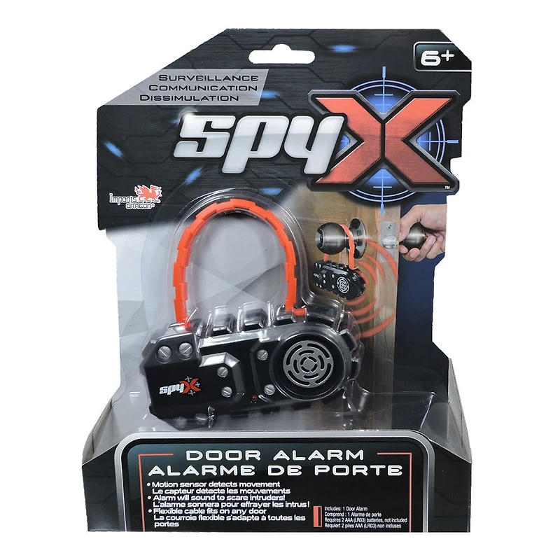 Le capteur détecte les mouvements L'alarme sonnera pour effrayer les intrus La courroie flexible s'adapte à tous les portes ou coffres-forts secrets Haut-parleur intégré Protège ton quartier général comme un agent secret de classe mondiale avec l'Alarme de porte SpyX! L'Alarme de porte SpyX s'adapte à toutes les portes pour effrayer les intrus et protéger vos choses! La courroie flexible qui s'adapte à toutes les poignées, attaches ou leviers. L'alarme sonnera lorsqu'un mouvement est détecté. Les gadgets SpyX vous aident à naviguer dans des opérations furtives : surveillance, communication, sécurité et défense. Collectionne tous les appareils fonctionnels SpyX pour déjouer les espions ennemis et ensuite dire : "?Mission accomplie!?"