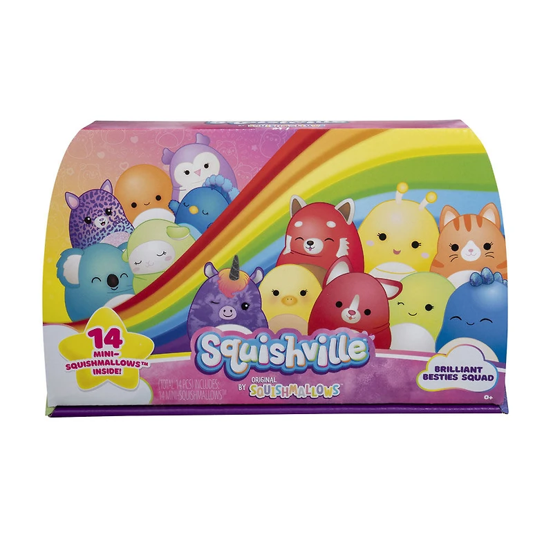 Prépare-toi à t'amuser avec le multipaquet Mini-Squishmallows Meilleures amies brillantes de Squishville, qui met en scène des Mini-Squishmallows irrésistiblement doux et colorés. Cet ensemble de peluches adorablement douces présente tes personnages en peluche Squishmallows préférés dans un mini format de 5 cm. Ajoute le multipaquet Meilleures amies brillantes à ta collection de l'univers de Squishville ! Avec un total de 12 personnages en peluche Mini-Squishmallows, l'ensemble comprend des personnages représentant toutes les couleurs de l'arc-en-ciel, de Cici le panda rouge à Holly la chouette violette, et toutes les couleurs entre les deux! Les personnages sont tous super mignons : un corgi, une pieuvre, un koala, un dino, et bien d'autres pour démarrer ta collection de l'escouade Squishville! Grâce à sa rembourrure super douce, les mignons jouets de l'univers de jouets Squishville sont les compagnons de jeu ultimes. Avec des véhicules, des ensembles de jeu et tes personnages Squishmallow en peluche préférés, l'univers de jouets Squishville déborde de personnalité!