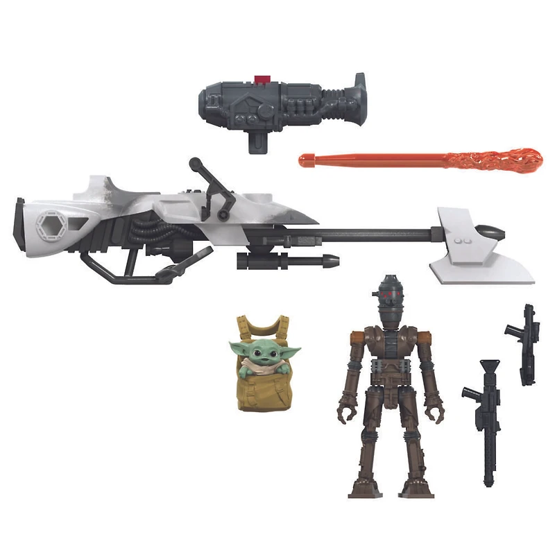 ACCESSOIRES ET DESIGN INSPIRÉS DE LA SÉRIE THE MANDALORIAN : Les figurines IG-11 et L'Enfant, et la moto speeder à l'échelle de 6 cm incluent un accessoire, 2 blasters, un lance-projectile déplaçable, un projectile et ont un design et une déco inspirés de la série sur Disney Plus