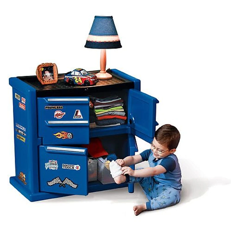Quand on ouvre les portes, on découvre un espace spacieux divisé par une tablette centrale moulée. Peut accueillir 2 tablettes en bois (non incluses). Comprend toute une panoplie d'authentiques autocollants de course. S'agence au lit convertible Step2 Stock Car (vendu séparément).