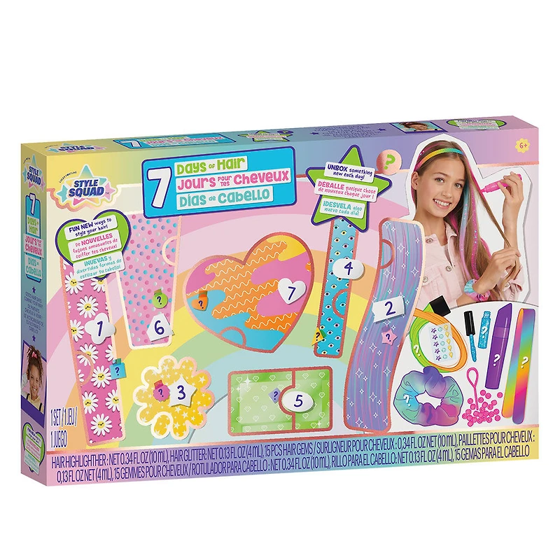 Faites de chaque jour une journée de soins personnels, avec 7 jours de cheveux de Style Squad! Révélez une nouvelle surprise capillaire chaque jour! Comprend 7 surprises pour des soins capillaires amusants toute la semaine! Améliorez votre style avec des perles de cheveux, des pierres précieuses pour cheveux, un bandeau coloré et un chouchou! Avec Style Squad 7 Days of Hair, vous avez tout ce dont vous avez besoin pour le salon de coiffure ultime à la maison! Utilisez le surligneur, les paillettes et l'extension de cheveux ombrés inclus pour rehausser votre look!
