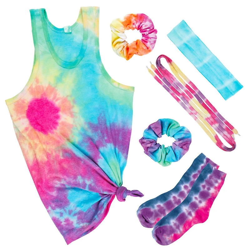 C'est l'ensemble tie-dye que vous attendiez. S'il s'agit de votre première tentative de teinture tie-dye ou si vous l'avez déjà fait, vous allez adorer ce kit. Notre super ensemble comprend tout ce dont vous avez besoin pour commencer, y compris la baignoire sans gâchis que maman appréciera. Non seulement vous obtenez les 7 teintures, mais vous obtenez également 6 projets de " teinture pour ", y compris un débardeur taille unique pour la plupart des enfants, une paire de chaussettes pour enfants, des lacets, 2 chouchous et un bandeau. Des instructions complètes et faciles à suivre sont incluses, ce qui en fait l'un des ensembles de colorants les plus complets.