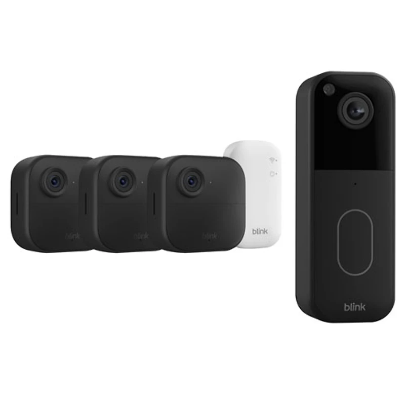 Système de surveillance avec caméras IP sans fil HD intégrale 1080p Outdoor 4 (3 unités) et sonnette vidéo Wi-Fi 1440p de Blink - Noir