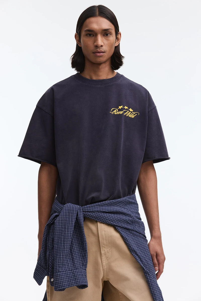 T-shirt en jersey de coton léger. Modèle carré à bord côtelé autour de l'encolure ronde, emmanchures tombantes et bas droit. Coupe ample pour une silhouette très ample.