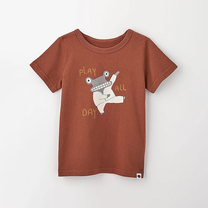 Ce t-shirt imprimé à manches courtes ajoute une étincelle de joie à n'importe quel jour de la semaine. Son encolure ras du cou et le jersey 100 % coton biologique dans lequel il est fait le rendent extrêmement confortable. Nos motifs signatures sont imprimés avec des encres douces au toucher. Il est offert dans une magnifique gamme de couleurs : crème, rayures crème, bleu pâle, gris texturé, brun racine, vert feuille, bleu pâle, ciel, bleu foncé, gris pâle, rotin et rouge.