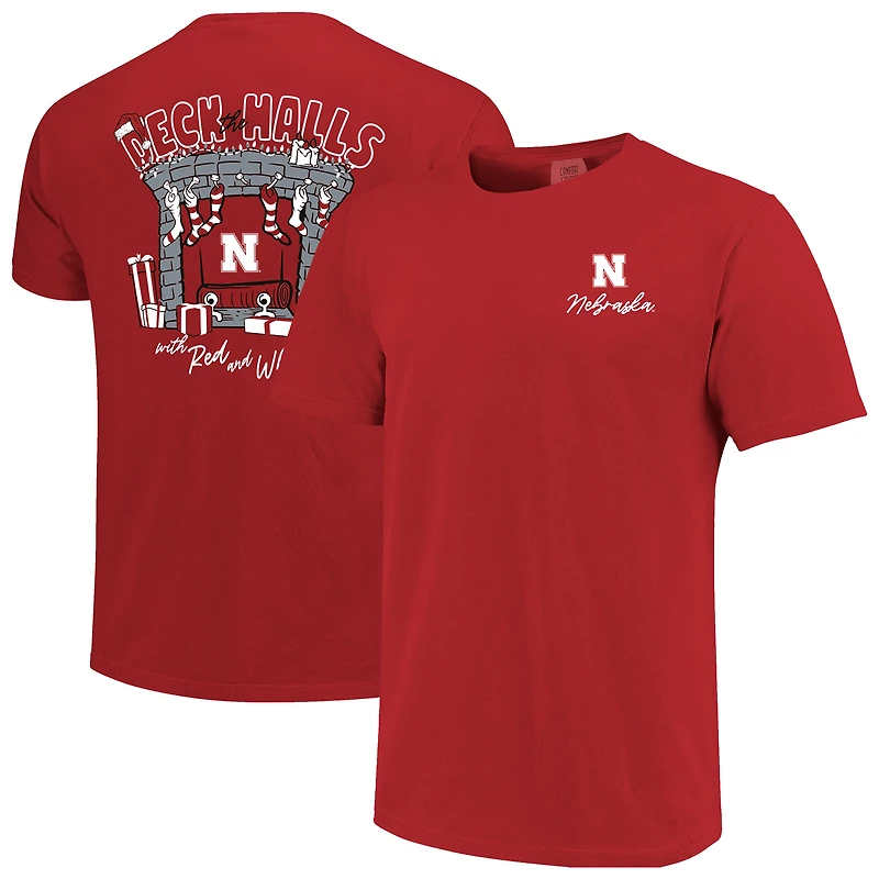 T-shirt rouge Nebraska Huskers pour homme, couleurs confortables, motif « Deck the Halls ».