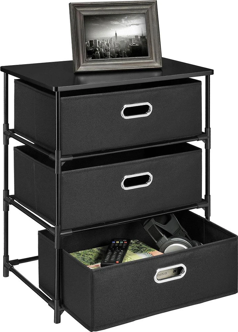 La table d'extrémité Altra noire à 3 bacs de rangement vous aide à être organisé. Il vous suffiront quelques minutes pour installer ce meuble grâce à sa construction facile à assembler, et sans outils. Les bacs pliables en toile à structure métallique solide fournissent une solution de rangement partout dans la maison. Dimensions Assemblés: 13.39"P x 18.5"L x 30.71"H