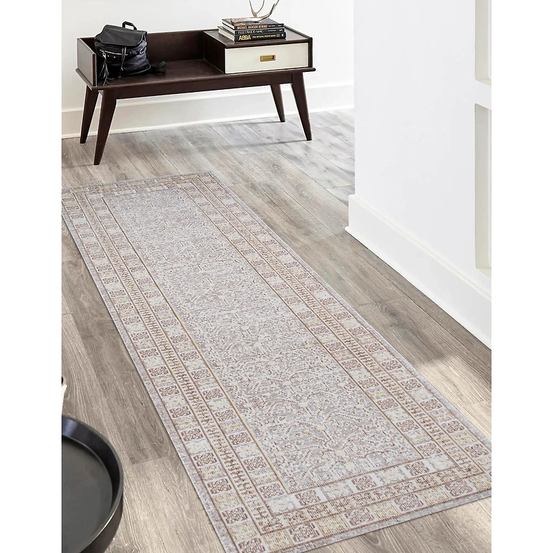 Les motifs classiques sont revisités dans des tons pastel doux et des neutres chaleureux pour un look à la fois élégant et moderne. Tissé à la machine en polyester, ce tapis résiste aux zones de passage tout en conservant son apparence et son touche