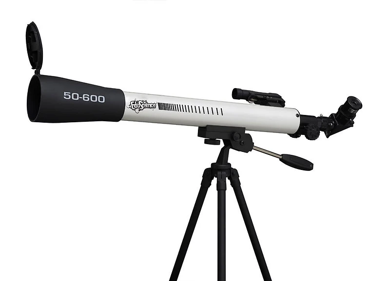 Télescope réfracteur 50/600, distance focale de 600mm. Altazimuth avec poignée de verrouillage panoramique, trépied pleine longueur en aluminium entièrement ajustable, oculaires H20mm et H12.5mm, 1.25"eyepieces, 48x optics.