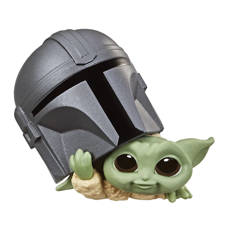Cette figurine adorable montre L'Enfant (Grogu) caché sous le casque, une pose inspirée des scènes de la série sur Disney+.