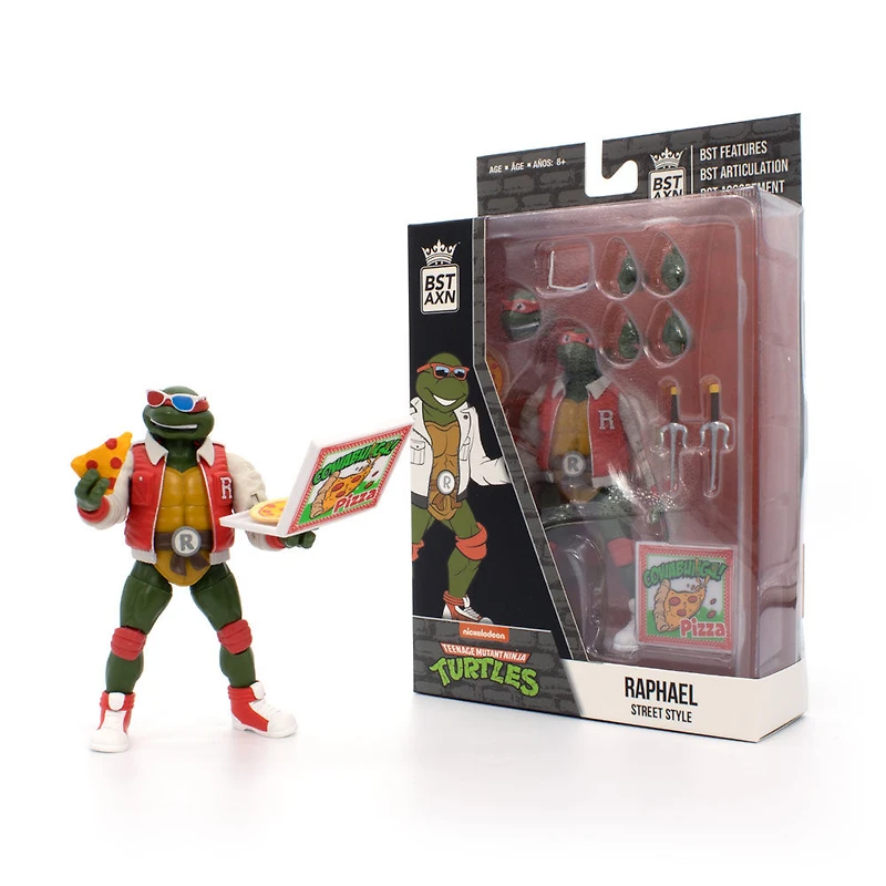 La marque BST AXN présente ce qui pourrait bien être les Tortues Ninja les plus cool jusqu'à maintenant. Vestes à écusson, planches à roulettes, radiocassettes, lunettes fumées, pizzas et mouvements de karaté distinctifs, vous aurez envie de vous amuser avec toutes les variations de Tortues Ninja de style urbain BST AXN. Comme chaque Tortue possède trois styles, il y a douze styles à découvrir et à collectionner! Cette tête brûlée a des opinions bien arrêtées et il est le membre le plus impulsif et agité des Tortues Ninja! Raphaël (Raph) adore tester ses forces au combat et s'entraîne par pur plaisir! Il est en général le premier à se lancer dans l'action et il est presque impossible de le faire renoncer au combat. Description du produit : Figurines de 12,7 cm conçues à l'échelle (1:15) avec 31 points d'articulation. Genoux à double articulation, articulations à rotule aux épaules, joint pivotant aux cuisses, joint rotatif aux chevilles, un joint pivotant aux poignets (de haut en bas et de gauche à droite), des paires de mains interchangeables, joints aux coudes, joint à rotule au cou, haut du torse flexible, joint pivotant à la taille, haut de la cuisse étirable. Portant une veste à écusson, le Raphaël de style urbain est offert avec deux paires de mains supplémentaires, une tête de remplacement, deux sais, des lunettes fumées et une pizza dans sa boîte. Chaque ensemble de figurine comprend un autocollant BST AXN et une superbe carte de collection exclusive des Tortues Ninja!