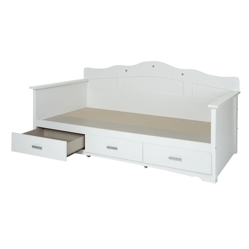La chambre à coucher de votre fille prendra des airs féériques avec ce magnifique lit de jour de la collection Tiara. Ses 3 tiroirs ornés de mignonnes poignées chromées complètent la fonctionnalité de ce meuble pratique, qui se rendra indispensable grâce à la polyvalence de ses nombreuses utilités.