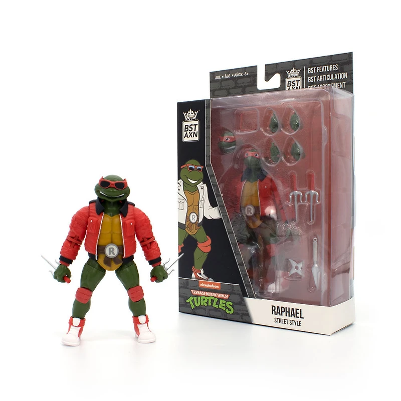 Figurines de 12,7 cm conçues à l'échelle (1:15) avec 31 points d'articulation. Genoux à double articulation, articulations à rotule aux épaules, joint pivotant aux cuisses, joint rotatif aux chevilles, un joint pivotant aux poignets (de haut en bas et de gauche à droite), des paires de mains interchangeables, joints aux coudes, joint à rotule au cou, haut du torse flexible, joint pivotant à la taille, haut de la cuisse étirable. Portant un coupe-vent, le Raphaël de style urbain est offert avec deux paires de mains supplémentaires, une tête de remplacement, deux sais, des lunettes fumées et une étoile de lancer. Chaque ensemble de figurine comprend un autocollant BST AXN et une superbe carte de collection exclusive des Tortues Ninja!