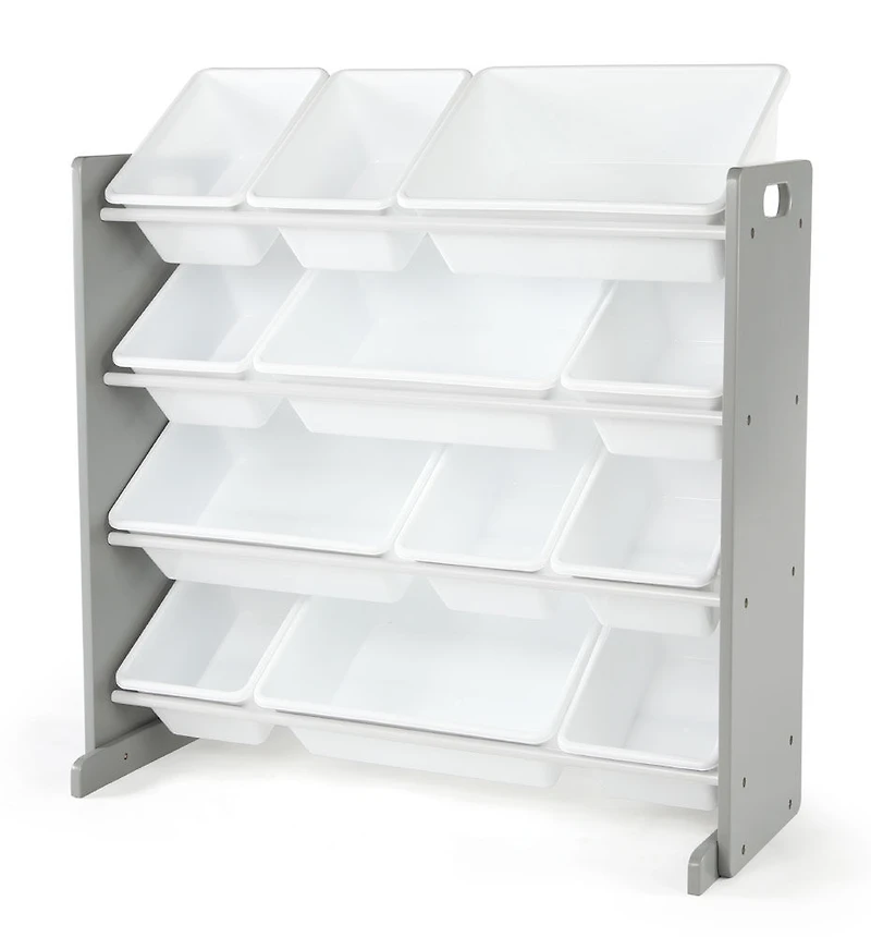 Le temps de jeu devient encore plus amusant quand les enfants peuvent sortir et ranger leurs jouets, livres et jeux eux-mêmes. Ce système peu encombrant avec 12 bacs permet de ranger les jouets dans des bacs en plastique sans BPA ni phtalates, où ils sont faciles à voir et à sortir. Comprend 8 bacs de taille standard et 4 grands bacs colorés faciles à positionner sur les 4 tablettes. Système de taille idéale pour les bambins et les enfants d'âge préscolaire. Structure en bois d'ingénierie avec renforts de stabilisation et tiges de tablettes en acier, supportant une charge maximale de 20 lb par tablette. Léger assemblage requis.