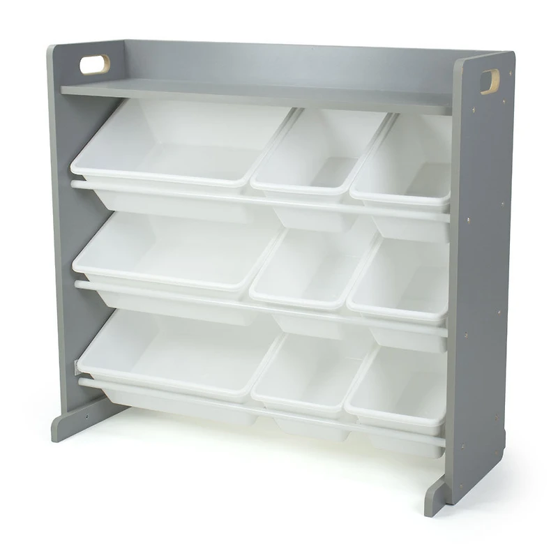 Le temps de jeu devient encore plus amusant quand les enfants peuvent sortir et ranger leurs jouets, livres et jeux eux-mêmes. Ce système peu encombrant avec 9 bacs et une tablette permet de ranger les jouets dans des bacs en plastique sans BPA ni phtalates, où ils sont faciles à voir et à sortir. Comprend 6 bacs standards et 3 grands bacs faciles à positionner sur les 3 tablettes. Système de taille idéale pour les bambins et les enfants d'âge préscolaire. La tablette du haut convient parfaitement aux livres, aux photos, aux poupées et autres jouets favoris. Structure en bois d'ingénierie avec renforts de stabilisation et tiges de tablettes en acier, supportant une charge maximale de 20 lb par tablette. Léger assemblage requis. Parfait pour les chambres et les salles de jeux.