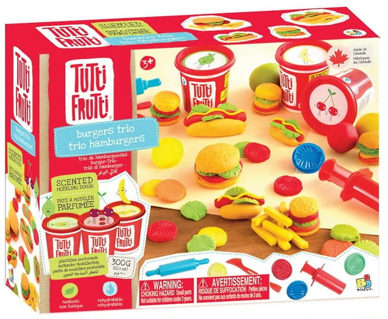 Ensemble de pâte à modeler Trio Hamburgers de Tutti Frutti. La fameuse pâte à modeler Tutti Frutti sent comme les vrais fruits, est particulièrement agréable à manipuler et ne s’égraine pas. De plus, elle est réhydratable et peut être mélangée à souhait. Les thématiques développées dans les activités sont particulièrement stimulantes et appréciées par les enfants.