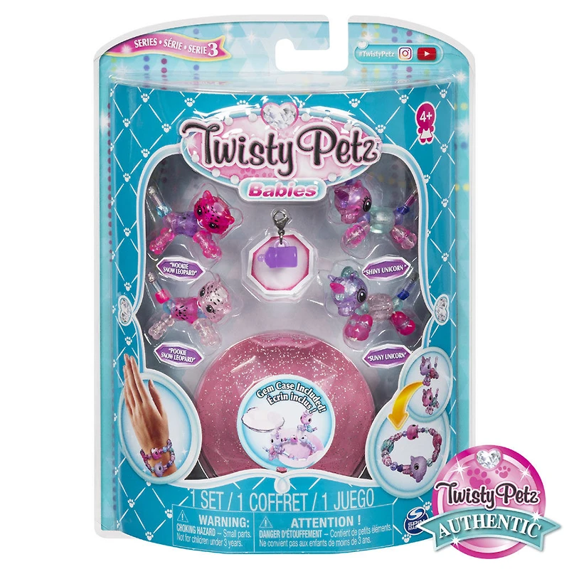 Entortillez-les ! Portez-les à votre poignet ! Emportez-les partout ! Les Twisty Petz sont des bracelets qui ne passent pas inaperçus et qui se transforment d'une simple torsion ! Ce coffret glamour contient quatre mini-animaux Twisty Petz composés de pierres précieuses éblouissantes, ainsi qu'un charm adorable et un écrin brillant ! Pour créer un bracelet, attachez deux mini-animaux et fixez-y le charm. Et voilà : vous avez un fabuleux bracelet qui ira avec toutes vos tenues. Vous pouvez aussi attacher trois mini-animaux ou plus pour créer un collier. Chiot, loutre, léopard des neiges ou même licorne : il vous suffit d'entortiller votre bracelet pour donner vie à d'adorables petits animaux ! Vous pouvez même porter vos mini-animaux Twisty Petz comme des bagues ! Quand vous ne portez pas vos bijoux et ne jouez pas avec vos mini-animaux, rangez-les dans l'écrin à bijoux en forme de pierre précieuse. Doté d'un couvercle à paillettes et d'un intérieur luxueux, cet écrin vous permet de ranger vos mini-animaux Twisty Petz en toute élégance. Collectionnez les 24 mini-animaux Twisty Petz de la Série 3 et créez des bagues, des bracelets, des colliers, des accessoires pour sac à dos, et bien plus encore ! Découvrez toutes les charmantes possibilités de Twisty Petz !