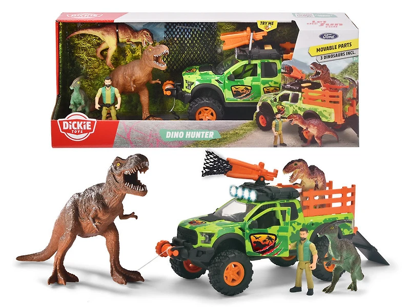 Dickie Toys - Véhicule de chasse aux dinosaures Dino Hunter (25 cm) - Voiture Ford Raptor avec sons et lumières, 3 dinosaures et figurine incluse - Jouet pour les enfants dès 3 ans