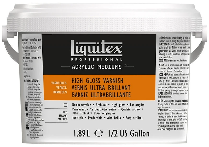 Le vernis ultra brillant de Liquitex rehausse l'intensité, la transparence et la luminosité des couleurs. Il protège et améliore la fluidité de la peinture et son adhérence aux supports. De viscosité moyenne, il devient transparent en séchant, reste souple et ne jaunit pas. Informations pratiques : Pour une utilisation intérieure et extérieure. Les vernis permanents sont non-réversibles et doivent toujours être testés avant d’être appliqués. La surface peinte doit être complètement sèche (entre 72 heures et 2 semaines, en fonction de l’épaisseur) avant d’appliquer le vernis. Agiter le vernis avant utilisation. Pour un meilleur résultat, agiter le vernis la veille et laisser reposer afin d'éviter les formations de bulles d'air lors de l'application. Le vernis peut également être mélangé doucement avec un bâton avant l’utilisation, ce qui prévient la formation de bulles. Appliquer 1 à 3 couches fines, plutôt qu’une seule couche épaisse. Une couche épaisse mettra plus de temps à sécher, pourrait couler ou s’affaisser durant l’application, et risque davantage de laisser apparaître les traces de pinceaux au séchage. Placer l’oeuvre à vernir à plat sur une table. Ne pas diluer le vernis, car il risque davantage de produire des bulles d’air. Utilisations : Peut être mélangé aux couleurs acryliques pour allonger la couleur ou créer des glacis brillants. Supports : convient à tous les supports. Séchage : 3 à 5 jours à l’acrylique. Laisser sécher 3 h entre chaque couche.