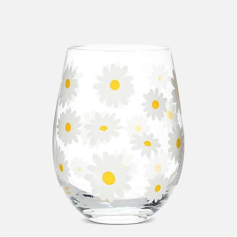 Ce verre est orné de marguerites d'un blanc éclatant. Un motif joyeux, idéal pour trinquer aux beaux jours, aux réunions décontractées et aux boissons qui méritent une petite touche florale.