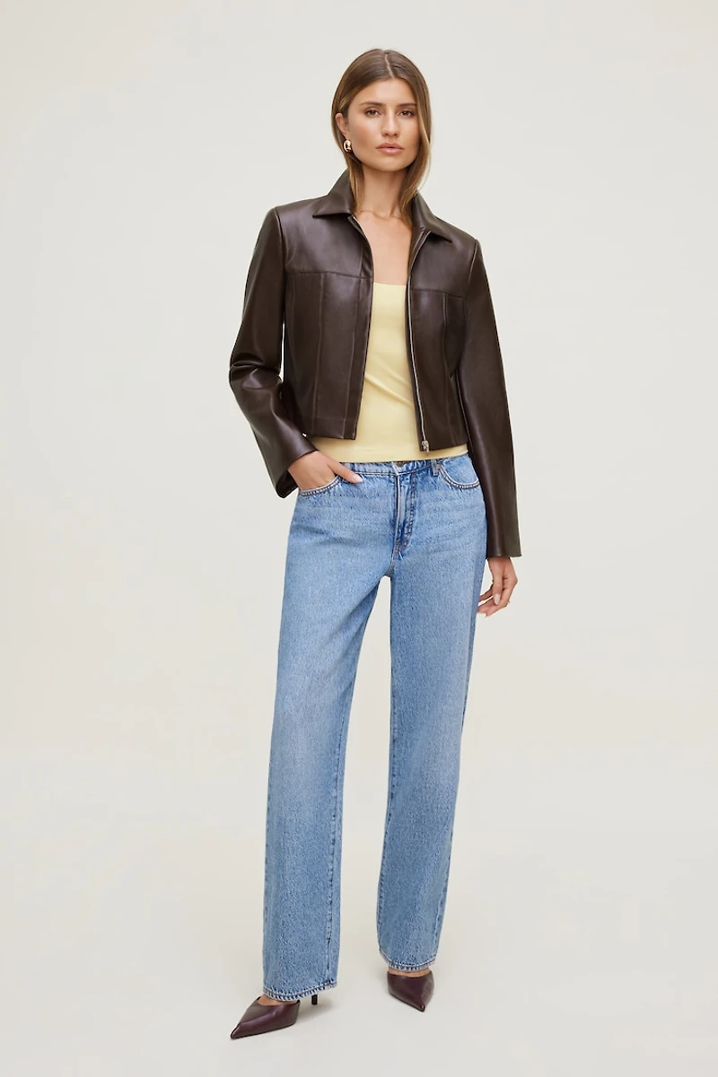 Ce veston est fait de faux cuir souple et structuré. Sa silhouette ajustée et légèrement écourtée lui confère un look épuré. Agencez-le à une