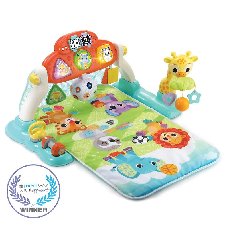 Faites bouger vos petits petons et soyez actifs avec Tapis d'éveil baby sport 4 en 1! Regardez votre bébé atteindre des étapes de motricité avec un tapis de jeu à plusieurs niveaux et des accessoires. Commencez par le sol, en tapant dans le ballon et en tapant sur le mobile de la girafe avec des formes suspendues. Prêt pour le jeu sur le ventre? Appréciez les personnages colorés et le hochet d'haltères, le ballon de bouilloire à torsion et à cliquetis, les cartes de couleur et bien d'autres choses encore, tout en aidant votre petit à renforcer ses muscles centraux. Faites participer les enfants pendant le jeu assis avec le panneau d'apprentissage interactif qui enseigne les couleurs, les formes et les animaux et renforce les compétences linguistiques. Emportez le panneau détachable pour jouer et explorer lors de vos déplacements. Retirez le ballon de football en peluche et donnez à votre enfant un défi supplémentaire pour marquer des buts. Faites un coup franc et marquez! Aller à la salle de sport n'a jamais été aussi facile. Conçu pour les enfants à partir de la naissance. Nécessite 3 piles AA. Piles non incluses.