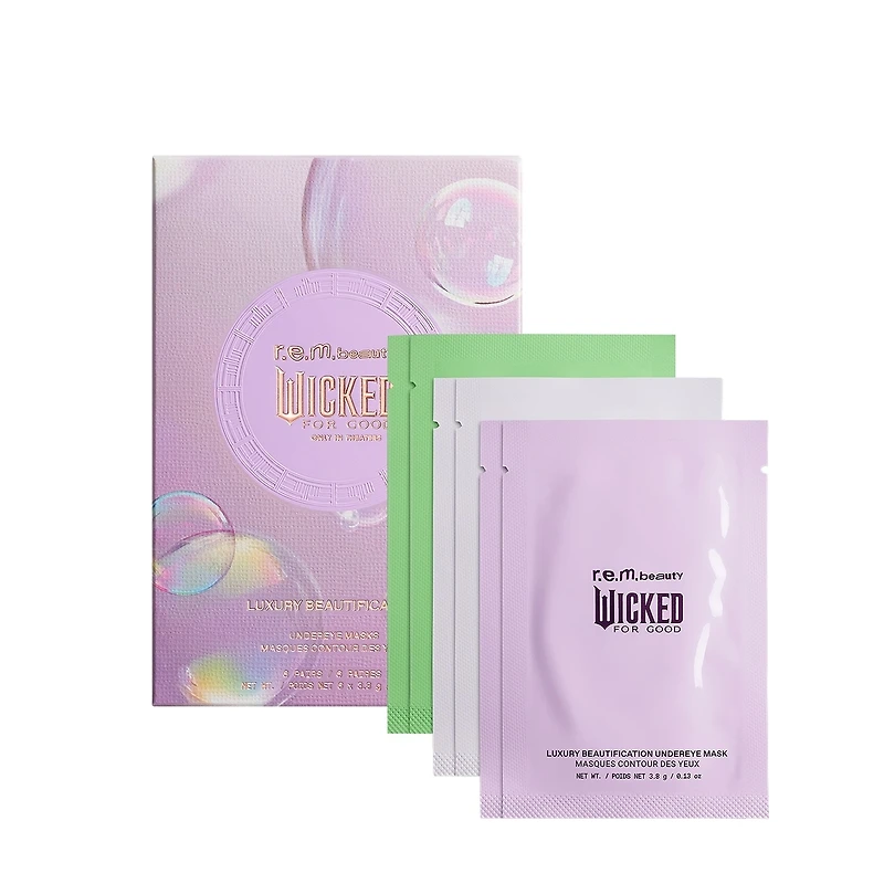 Édition limitée r.e.m. beauty x Wicked: For Good des patchs yeux en gel inspirés de la bulle de Glinda, du vert éclatant de la Emerald City et de l’argent du Tin Man. Enrichis en acide hyaluronique et en caféine, ils hydratent, apaisent et défatiguent le contour des yeux, que vous soyez en mode détente ou mise en beauté.