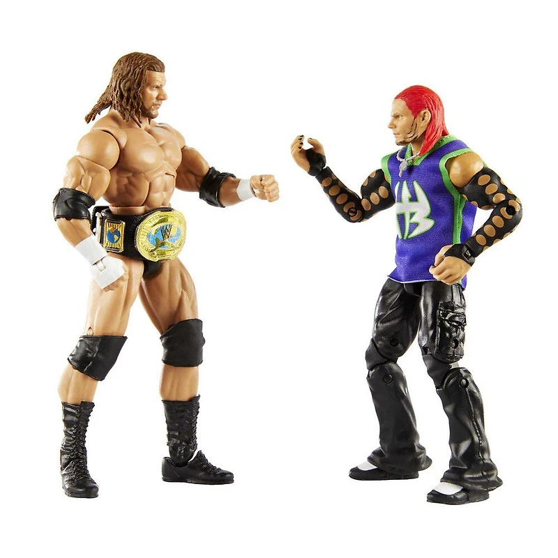 Rends ta collection de figurines articulées deux fois plus élite avec le coffret de 2 figurines articulées Triple H contre Jeff Hardy de Collection Elite WWE! Ce coffret de figurines de 15,24 cm (6 po) de haut, destinées au jeu ou à la présentation, célèbre la rivalité emblématique de leur match de Smackdown 2001. Chaque figurine de Collection Elite propose des traits réalistes créés avec la technologie Tue FX et comprend 1 tenue d'entrée de ring authentique, des mains interchangeables, ainsi que 1 ceinture de Championnat intercontinental pour recréer l'action dans le ring. Les couleurs et les motifs peuvent varier.